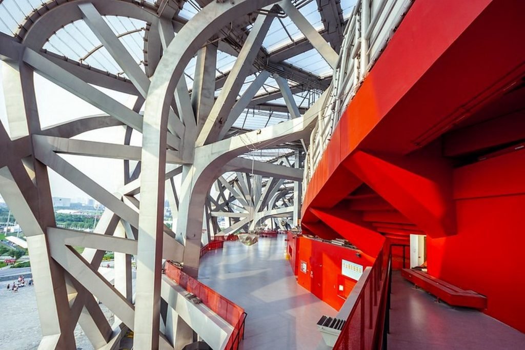 The most distinctive feature of the Bird’s Nest is its intricate lattice-like steel structure. This web-like pattern, inspired by Chinese ceramics and traditional wooden lattice windows, creates a mesmerizing visual effect. The interlocking steel beams form a complex network, resulting in a stunning and dynamic architectural form that defies convention.