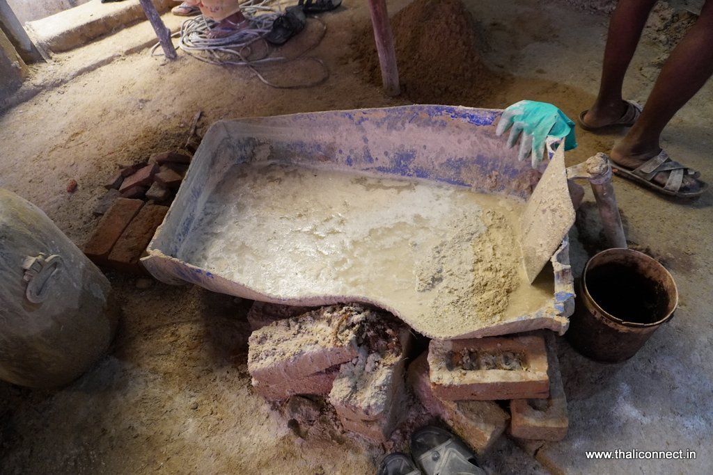The process began with the sourcing of lime from Pollachi, where Ar. Akshaya explained the crucial difference between baked and raw lime. The initial step involves slaking the lime: adding water causes it to bloom, generate heat, and release carbon dioxide. This mixture is then left to ferment for a minimum of 15 days. The longer the fermentation sometimes with sand already mixed in the better the resulting mortar’s texture and plasticity. This carefully prepared lime ‘milk’ is later filtered and mixed with sand to create the thick, paste-like mortar used for binding the walls and roof elements.