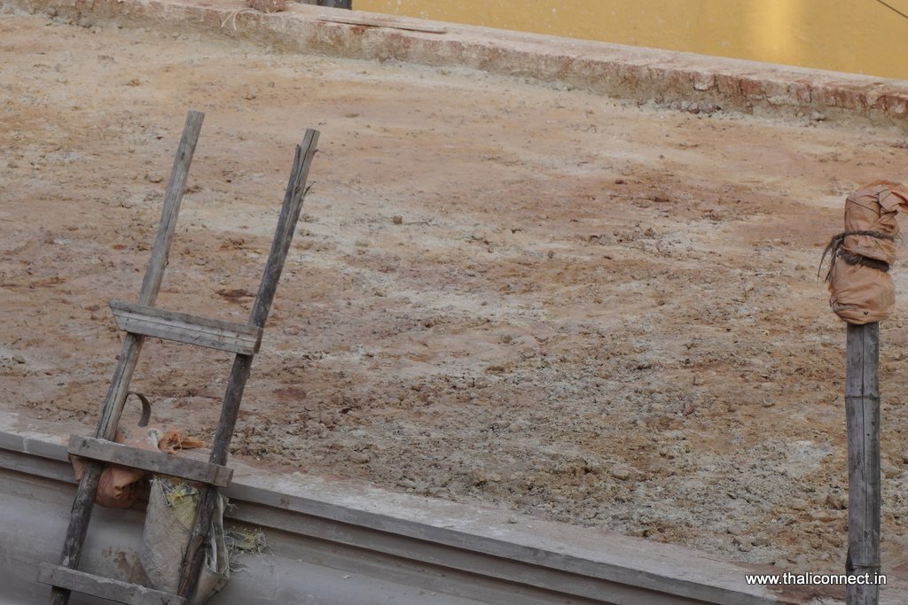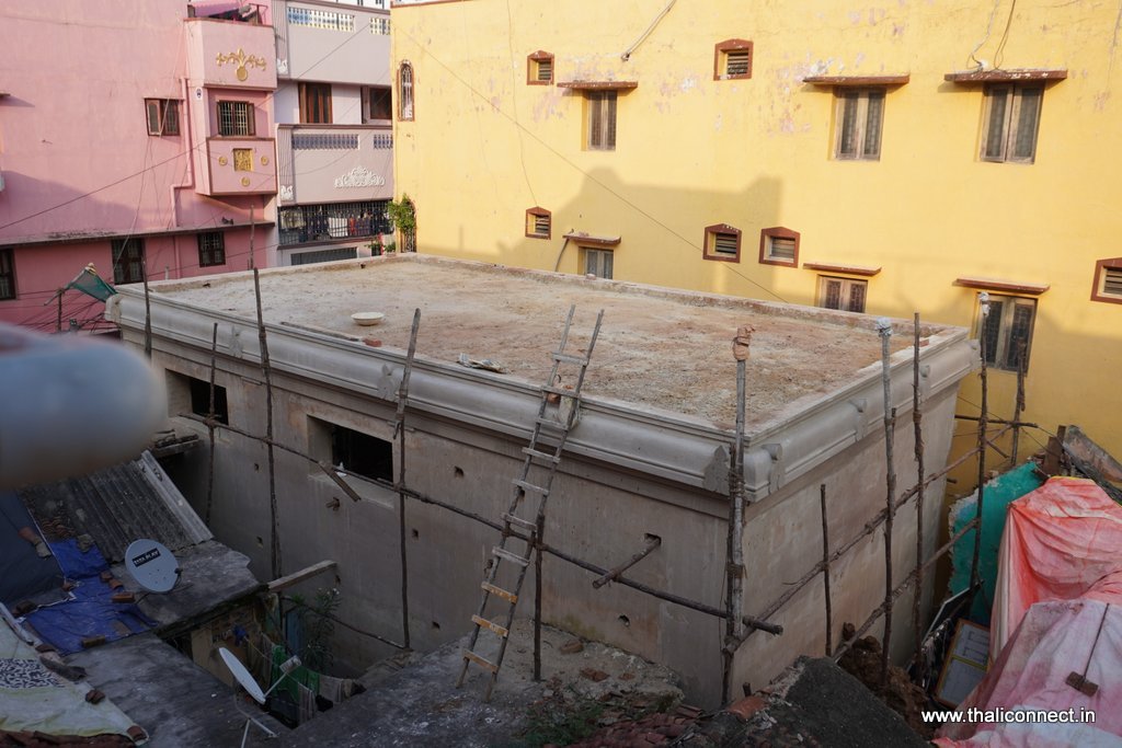 We visited a project in Choolai, Chennai, Tamil Nadu, where the roof for the mandapa (a pillared hall) was in its final stages, allowing us to witness the traditional plastering work being done on a structure featuring three garbhagriha (sanctum sanctorum).
